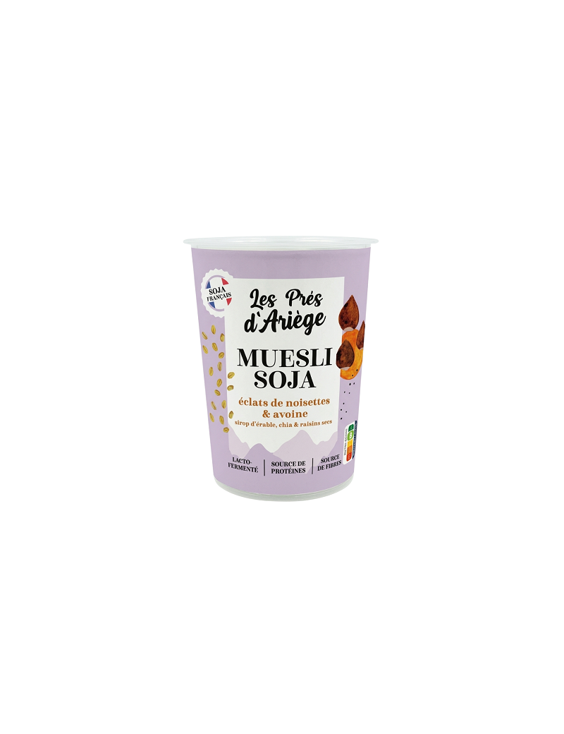 Un dessert végétal gourmand associant soja français fermenté et super muesli, pour une texture onctueuse et légèrement granuleuse rappelant le porridge. Élaboré à partir de soja cultivé en Occitanie garanti sans OGM, ce dessert biologique est enrichi d’ingrédients savoureux : flocons d’avoine sans gluten, noisettes grillées, raisins de Corinthe et graines de chia. Le tout est délicatement sucré au sirop d’érable et sucre de canne équitable. Naturellement source de protéines et de fibres et faible en acides gras saturés, il constitue une alternative végétale idéale pour le petit-déjeuner ou une pause gourmande.
