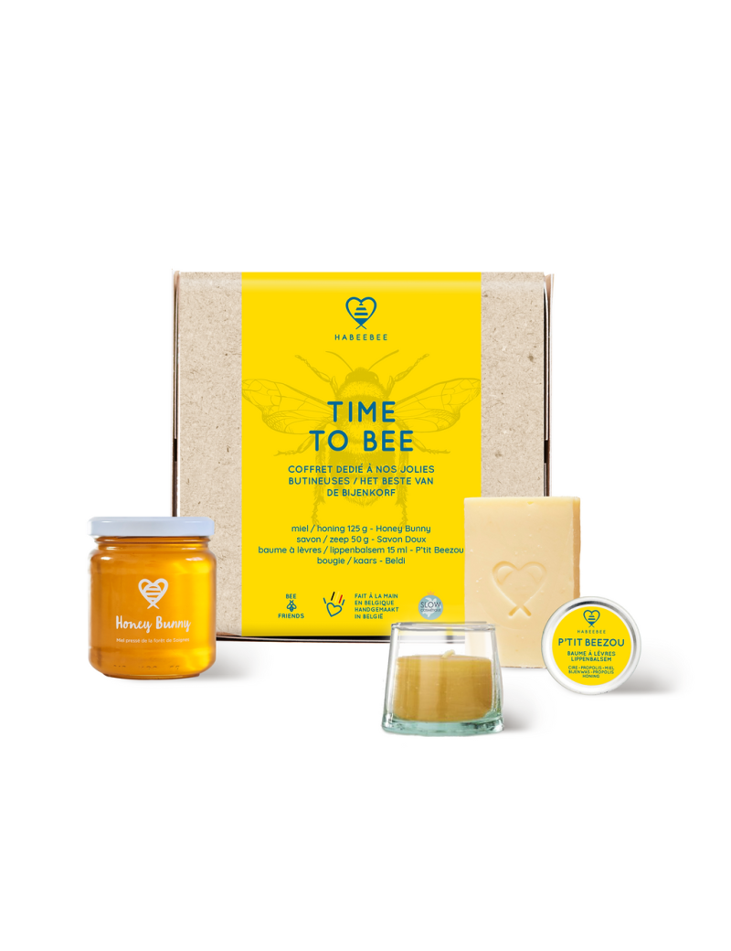 La box cadeau TIME TO BEE est une invitation à prendre soin de soi en douceur, tout en célébrant les trésors de la ruche. C’est le coffret idéal pour les amoureux de nature, d’artisanat et de bien-être responsable.Ce coffret contient :Un savon doux (100?g) – Saponifié à froid et enrichi en cire d’abeille, ce savon nettoie la peau en douceur tout en respectant son équilibre naturel.Un pot de miel Honey Bunny – Un miel toutes fleurs récolté avec amour, aux arômes floraux riches et délicats.Une bougie Beldi – Fabriquée à base de cire d’abeille, pour une ambiance chaleureuse et naturelle.Un baume à lèvres au miel – Ultra-nourrissant grâce à l’alliance du miel, de la cire d’abeille et de la propolis. Parfait pour réparer et adoucir les lèvres en toutes saisons.