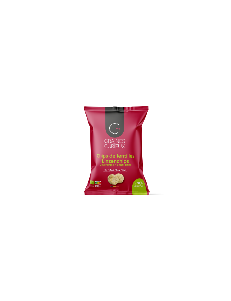 Découvrez nos chips de lentilles saveur sel soufflés et croustillants qui sauront ravir vos papilles en plus des bénéfices nutritionnels. Nos chips de lentilles sont sources de protéines et de fibres, ils contiennent 70% de matières grasses en moins par rapport à un chips de pomme de terre classique. Ils sont sans gluten, sans arômes ajoutés et sans huile de palme. La teneur en sucre de nos chips de lentilles est faible. À consommer nature ou à diper.