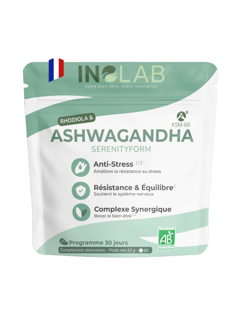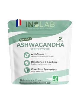 Complexe de 2 plantes adaptogènes Bio : Ashwagandha & Rhodiola, utilisées traditionnellement pour optimiser les capacités de l’organisme à s’adapter à un stress physique ou mental.