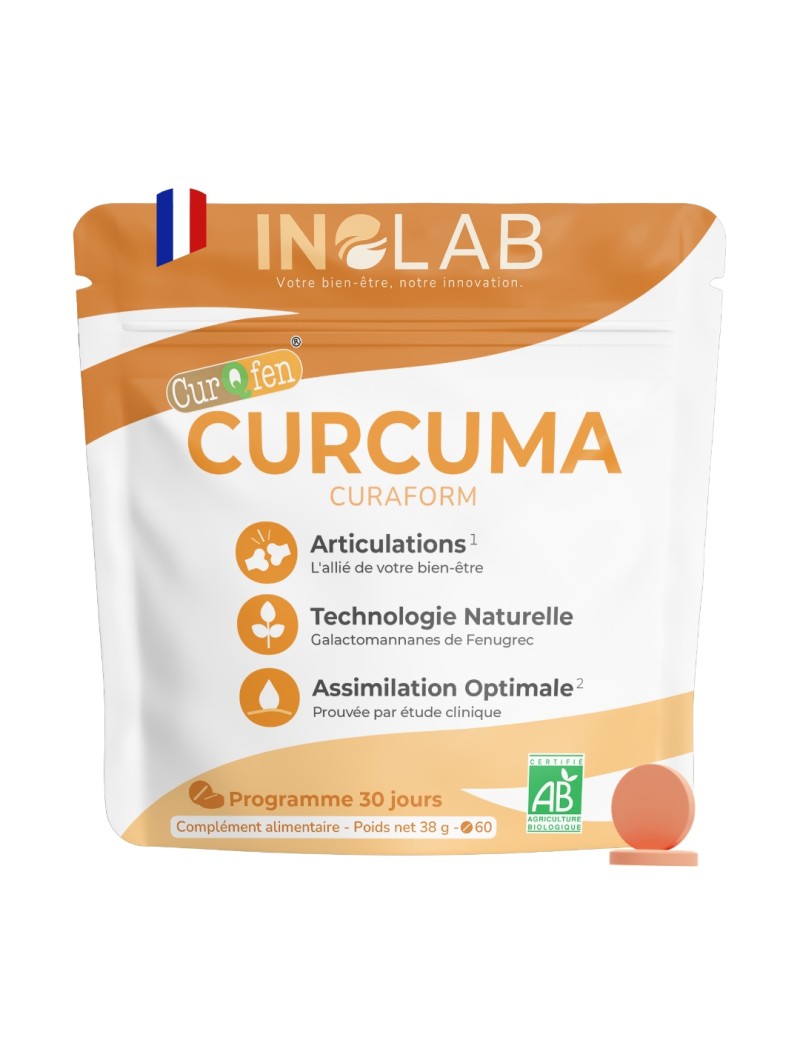 Découvrez Curaform, notre curcuma bio titré en curcumine breveté Curqfen® pour une assimilation optimisée et une effet prolongé pendant 12h.