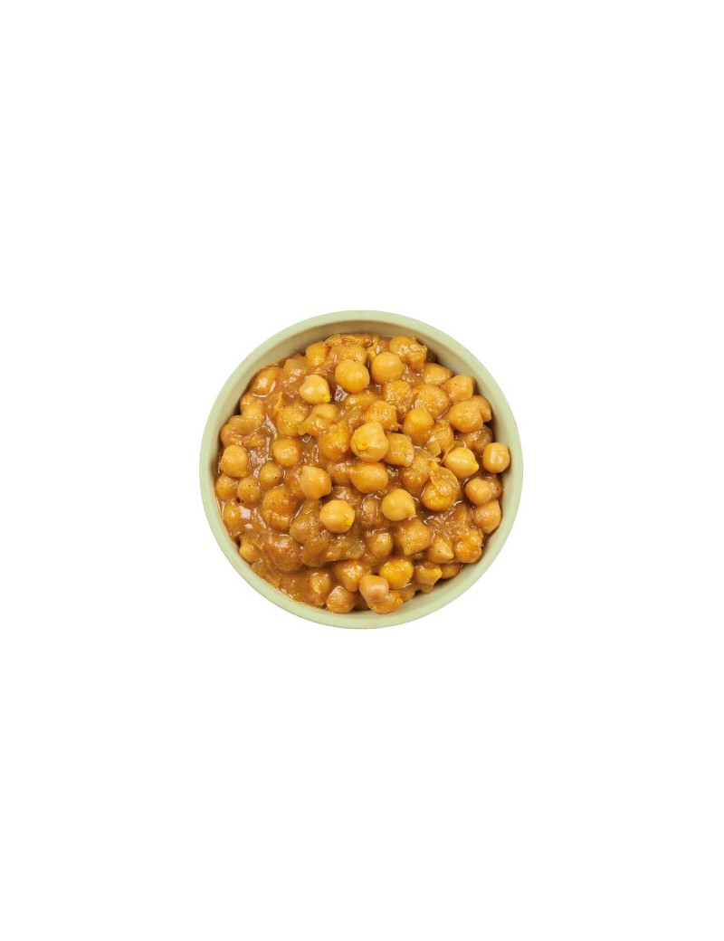 Chickpea Curry est un curry jaune d'inspiration indienne composé de pois chiches mijotés avec du gingembre, des épices et d'autres ingrédients aromatiques. Prêt à être consommé, riche en protéines et en fibres, composé d'ingrédients biologiques peu transformés et 100 % végétal, il est idéal pour tous ceux qui souhaitent réduire leur consommation de protéines animales. Idéal sur un lit de riz avec des légumes sautés comme des poivrons et de la menthe fraîche.