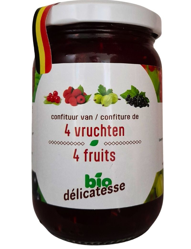 Sucre de canne fair trade 49%, framboises* 25%, cassis* 8.3%, groseilles à maquereaux* 8.3%, groseilles rouges* 8.3%, correcteur d'acidité: jus de citron*, gélifiant: agar agar*