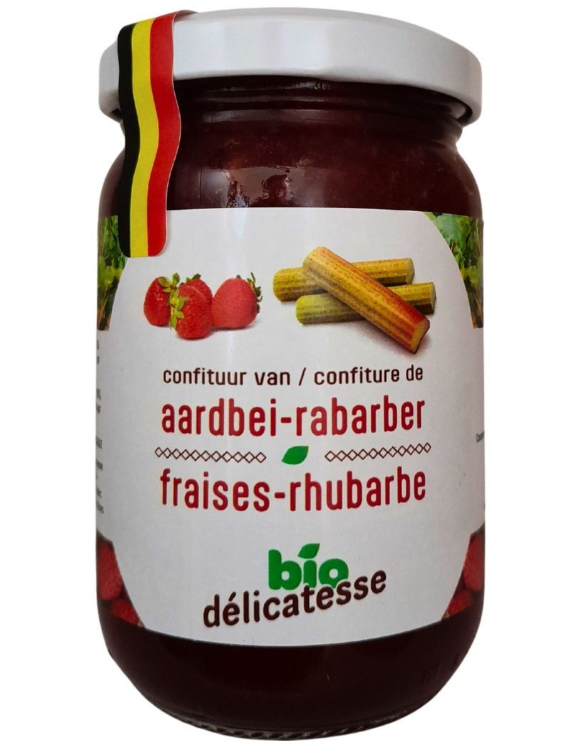 sucre de canne fair trade 49%, fraises* 25%, rhubarbe* 25%, correcteur d'acidité: jus de citron*, gélifiant: agar agar*