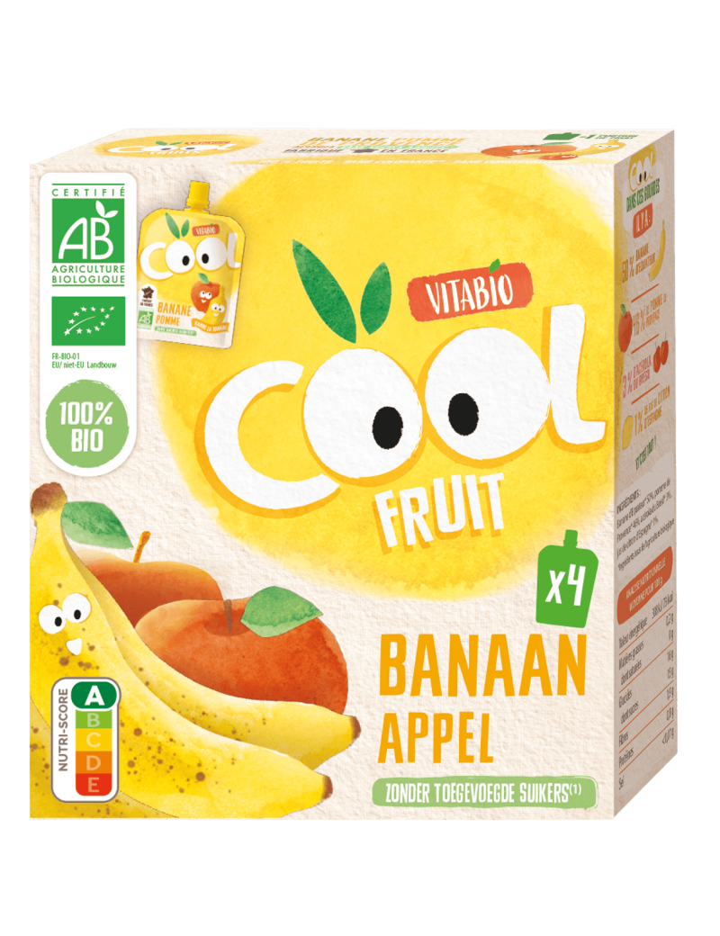 Banane* 50%, pomme de France* 49,5%, jus de citron concentré* 0,5%.*Ingrédients issus de l'agriculture biologique