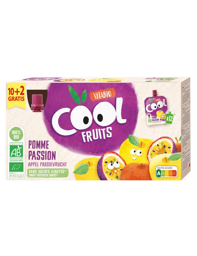 Pomme de France* 77,9%, jus de fruit de la passion* 14%, banane* 8%, jus de citron* 0,1%.*Ingrédients issus de l'agriculture biologique