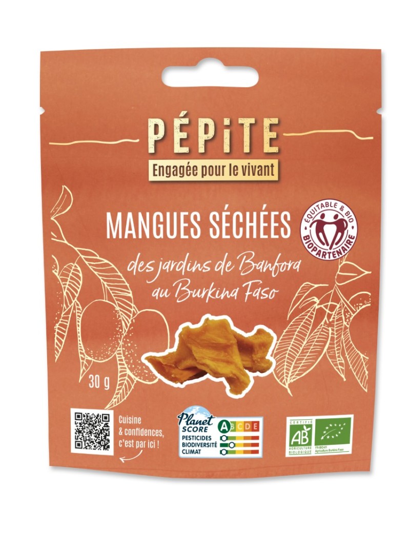Fermez les yeux, croquez… et laissez la magie opérer ! Les mangues séchées bio et équitables de Pépite dévoilent une chair moelleuse et un goût intensément fruité. Issues de la variété Brooks, elles mûrissent sur les plateaux de Banfora au Burkina Faso avant d’être séchées avec soin afin de préserver toute leur douceur naturelle et leur richesse aromatique. Leur saveur sucrée, équilibrée par une légère touche acidulée, éveillera vos papilles à chaque bouchée !Le saviez-vous ? Les mangues sont riches en fibres. Or notre régime alimentaire est souvent déficient en fibres alimentaires.