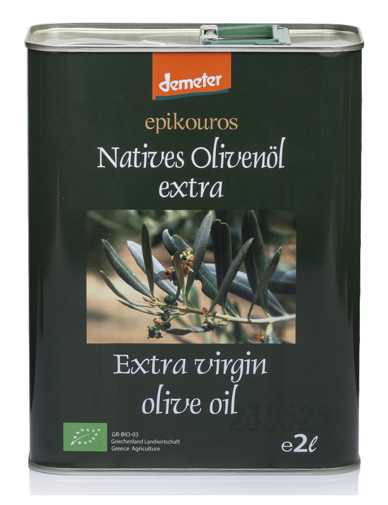 Huile de qualité supérieure, 1ère pression à froid. Pour cette huile labellisée , les olives, cultivées en biodynamie dans le Sud du Péloponnèse, sont récoltées, lavées, puis pressées dans les 24h. L'huile est simplement filtrée puis mise en bouteilles. En 2023 et pour la quatrième année consécutive, l'huile d'olive extra vierge d'Epikouros a été récompensée par la médaille d'or lors de la XXVIII ème édition de BIOL pour la meilleure huile d'olive extra vierge biologique du monde.L'huile d'olive extra vierge Demeter d'Epikouros a été élue en 2022 parmi les 10 meilleures huiles d'olives bio présentées à Biofach, le plus grand salon de l'agriculture biologique au monde, obtenant ainsi une reconnaissance internationale !