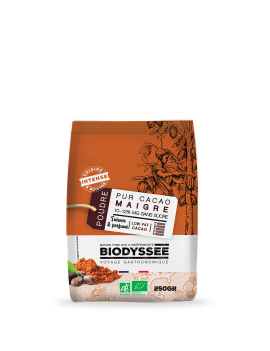 Poudre de cacao 20-22%. Le cacaoier est l'arbre de vie des Mayas, La graine du fruit contient un dérivé des polyphénols, la procyanidine,...