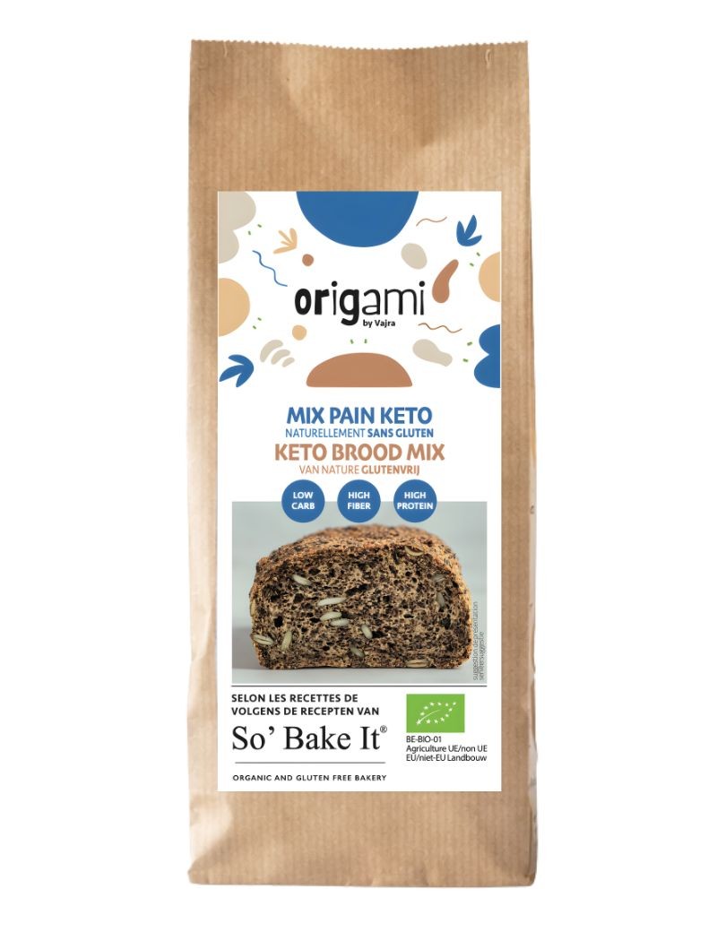 Mélange naturellement sans gluten pour la confection d'un grand ou deux petits pains keto. 1. Passez le mix dans un blender quelques secondes pour obtenir un pain moelleux (optionnel) ou gardez-le tel quel pour une texture de pain aux graines 2. Versez le mix dans un bol. 3. Ajoutez 40g de yaourt, 2 œufs entiers et 75g d'eau. 4. Mélangez pour obtenir une pâte homogène. 5. Laissez reposer 5 min et façonnez la pâte en boule(s). 6. Enfournez 1h à 170 °C.Valeurs nutritionnelles moyennes pour 100 g : énergie 1855 kJ / 444 kcal ; matières grasses 33,7 g dont acides gras saturés 5,1 g ; glucides 14,5 g dont sucres 3,2 g ; fibres alimentaires 26,3 g ; protéines 19,2 g ; sel 2,5 g.