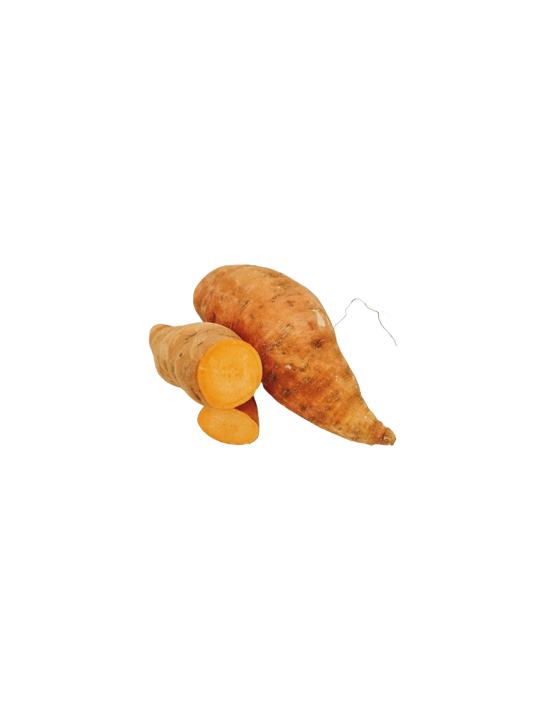 La patate douce est un légume-racine à chair ferme et colorée. Elle se consomme cuite, notamment rôtie, bouillie, vapeur ou intégrée à diverses préparations culinaires, comme accompagnement ou ingrédient de plats chauds.