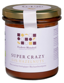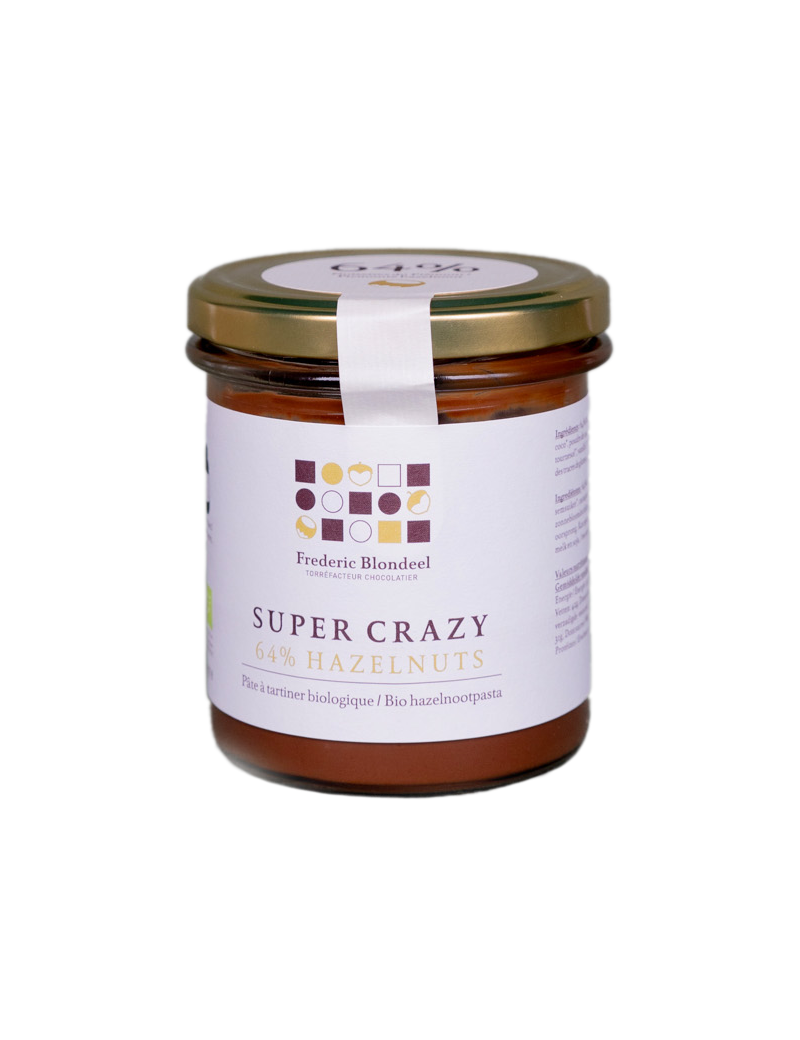 Nos pâtes à tartiner sont une ode à la noisette.Ce produit est un vrai bonheur pour nous. On joue, mais on ne plaisante pas. Gorgée de noisettes grillées (jusqu'à 65%), chacune de nos pâtes à tartiner rend hommage à la magnifique qualité de la noisette italienne.SUPER CRAZY - 64% de noisettes et à base de sucre de fleur de coco.