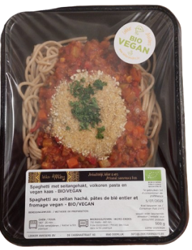 Un délicieux spaghetti avec des pâtes au blé complet, du seitan haché, une sauce tomate riche et du fromage végétalien ; un plat réconfortant délicieux et sain.