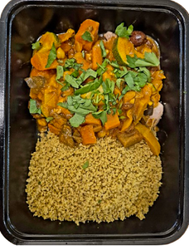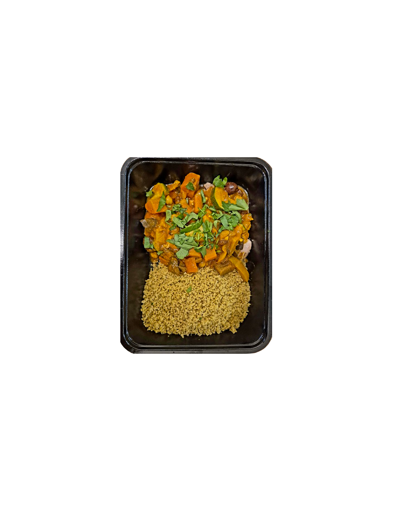 Tajine épicé avec de délicieux légumes verts, olives et poulet. Servi avec du couscous de blé entier.