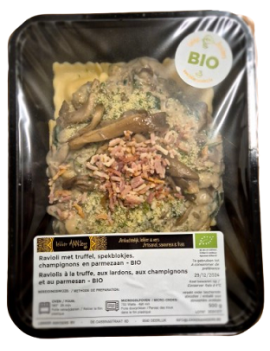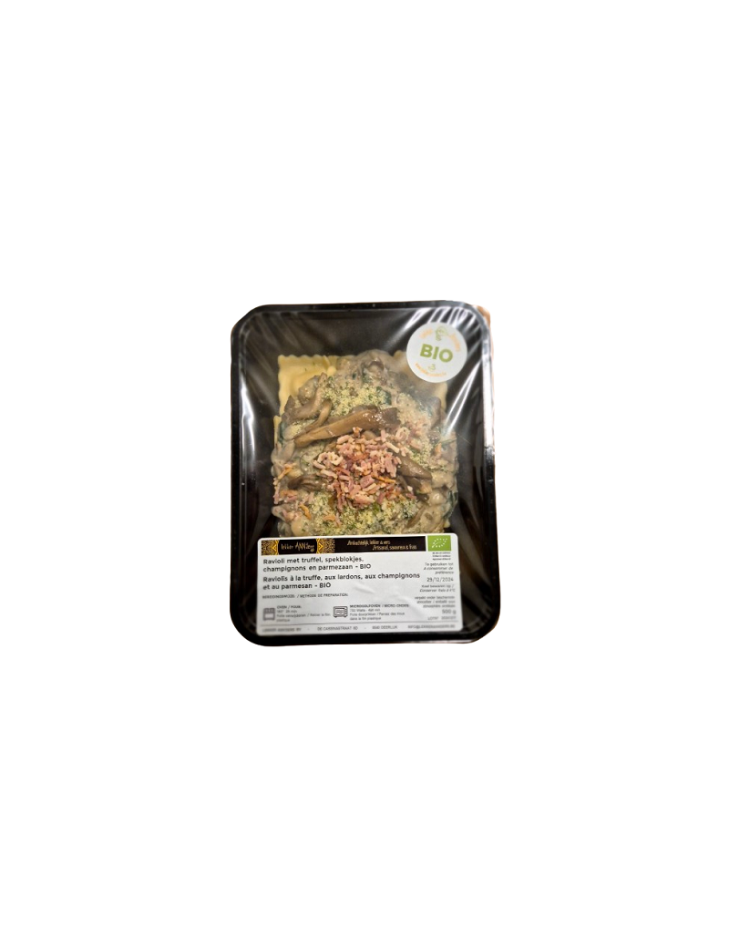 Un délicieux ravioli aux truffes servi avec une sauce crémeuse aux champignons avec courgette, brocoli et bacon. Sublimé avec du parmesan et des graines de tournesol.