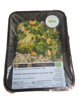 Tendre poulet avec une délicieuse sauce au curry, brocoli et riz aux noix, un classique !