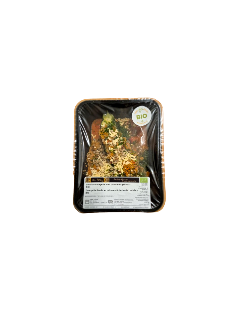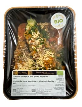 Courgette fourrée d'une farce épicée à base de quinoa, de légumes verts recouverts de tomates et de viande hachée, servie avec une sauce au paprika et saupoudrée de fromage haché.