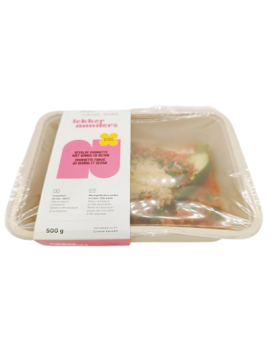 Courgette farcie d'une farce épicée à base de quinoa, de légumes verts recouverts de tomates et de seitan haché, servie avec une sauce au paprika et saupoudrée de fromage.