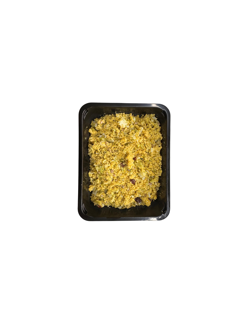 Un taboulé végétarien à base de couscous, brocoli, chou-fleur, raisins secs et graines, assaisonné d’huile d’olive et jus de citron.