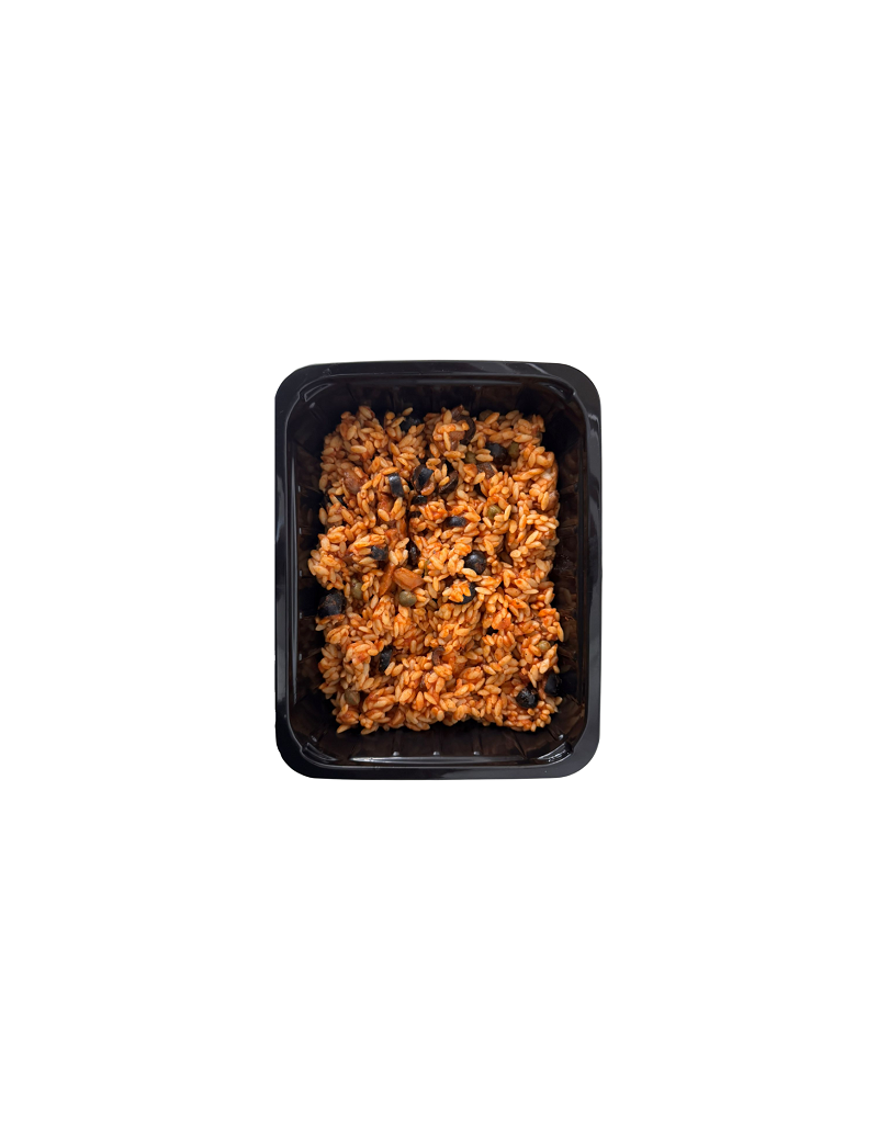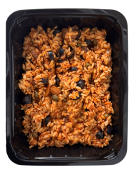 Orzo (semoule de BLÉ dur, eau), champignon, roquette, olive noire, concentré tomate, oignon jaune, huile de tournesol, câpre, sel, persil, poivre noir