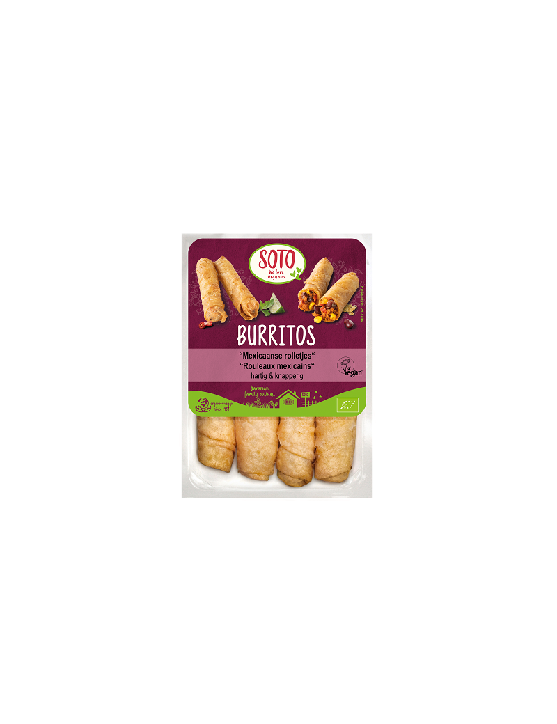 Préparation salée de type Tex-Mex, composée d’une galette de blé garnie d’un mélange de haricots rouges, tomates, maïs, poivrons rouges et tofu. Les burrito rolls sont croustillants après cuisson et adaptés à un usage snacking ou apéritif.