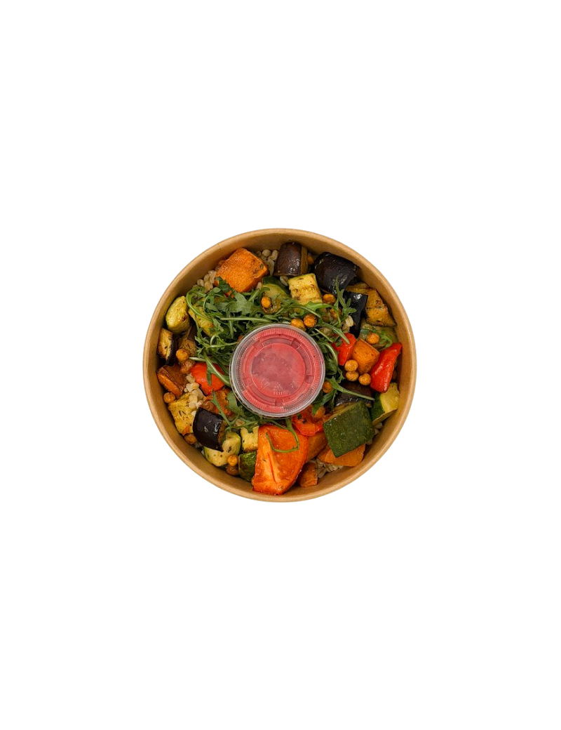 Bowl vegan à base de blé mondé, légumes rôtis et pois chiches, accompagné d’un coulis de fruits rouges légèrement acidulé. Une recette originale mêlant fraîcheur, douceur et notes grillées.