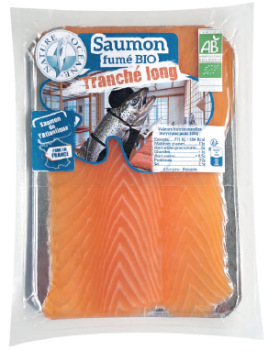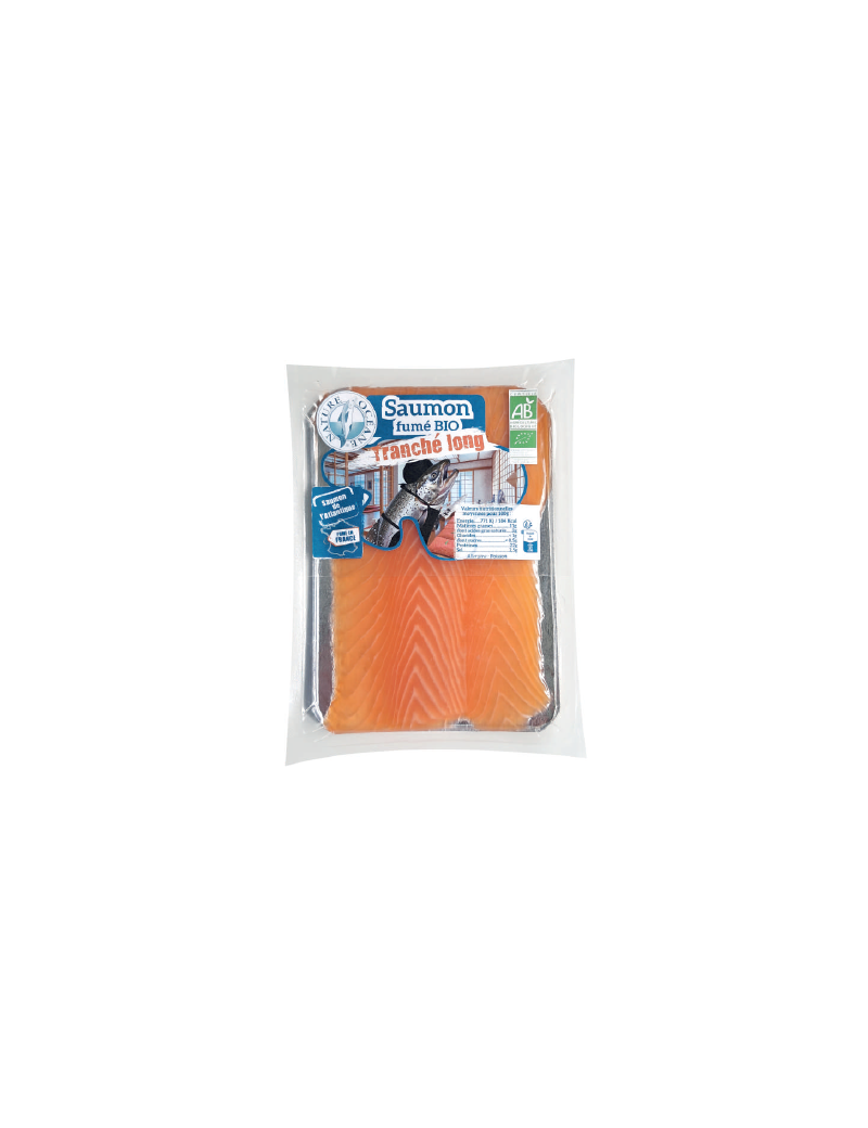 Saumon fumé présenté en longues tranches, élaboré selon un fumage lent au bois de hêtre. Le poisson est salé à la main au sel sec et tranché manuellement dans le sens de la longueur.
