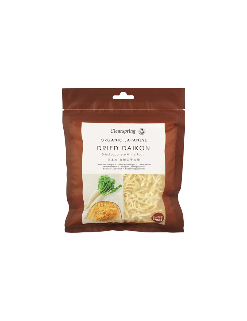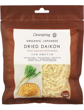 Le daikon est un radis blanc japonais qui est simplement séché et rapé. Il a un goût doux et contient des enzymes favorisant la digestion, cuit en même temps que le kombu il a un effet puissant. Pour l'utiliser le laisser tremper dans l'eau 30-45 minutes, puis vider le surplus d'eau (à utiliser pour un bouillon éventuellement), enfin mijoter ou sauter avec d'autres légumes.