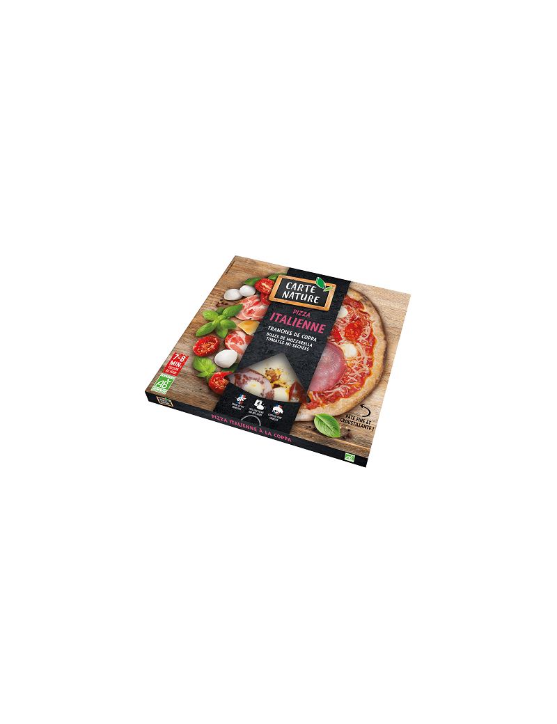 Un savoureux mélange à l’italienne : sauce tomate garnie d’emmental, mozzarella et coppa. Une recette typique qui évoque les saveurs méditerranéennes.