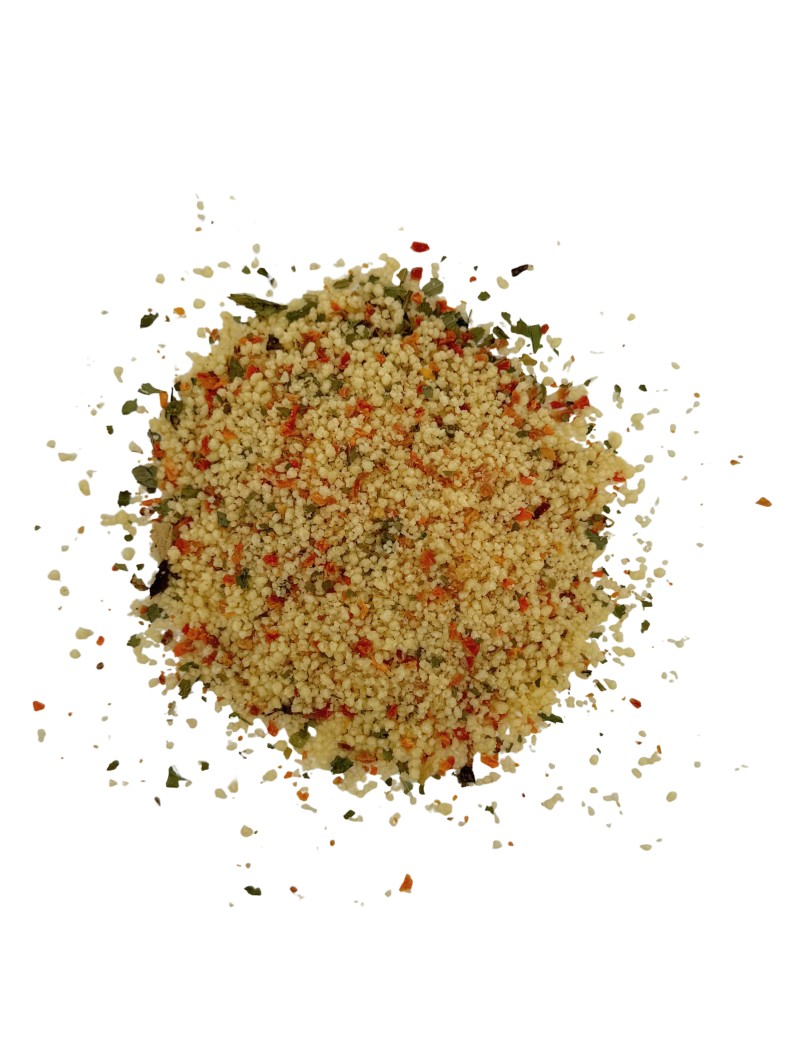 Un mélange léger et ensoleillé à base de semoule de blé dur, agrémenté de légumes et d’herbes aromatiques. Frais et parfumé, il est idéal pour un repas estival rapide et savoureux.Mode de préparation (2–3 portions)Verser une portion du mélange dans un bol ou une casserole.Ajouter le même volume d’eau bouillante.Couvrir et laisser gonfler pendant 5 minutes.Égrainer à la fourchette.Ajouter un filet d’huile d’olive selon votre goût.