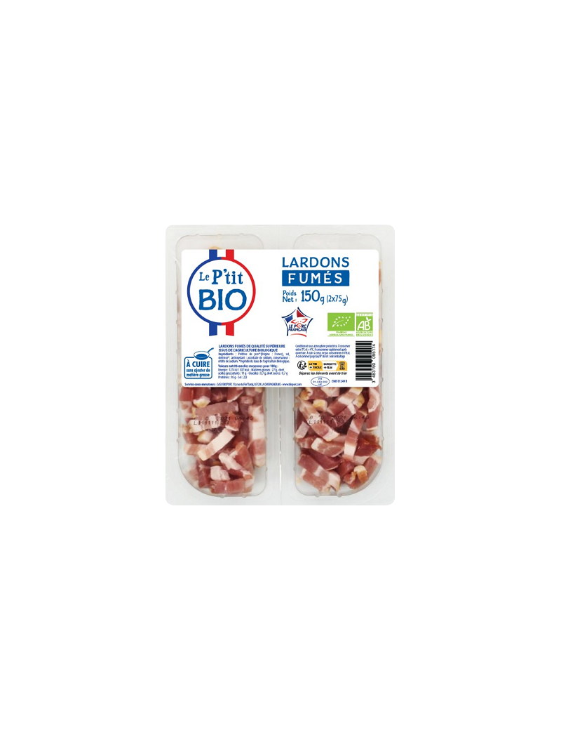 Le P'tit BIO lardons worden gemaakt van gepekelde buiken van lokale Franse varkens. Daarna wordt de buik gestoomd en gerookt boven beukenhout. Daarna wordt hij in staafjes gesneden om de vorm van de lardons te krijgen. Een culinaire must-have voor in je koelkast, spek is ideaal voor zowel warme als koude gerechten (quiches, linzen, pizza's, omeletten, salades, pasta, etc.). Bacon moet gekookt worden gegeten, niet rauw. Bak ze 5 minuten of laat ze sudderen bij je gerecht.
