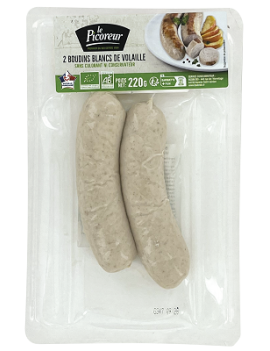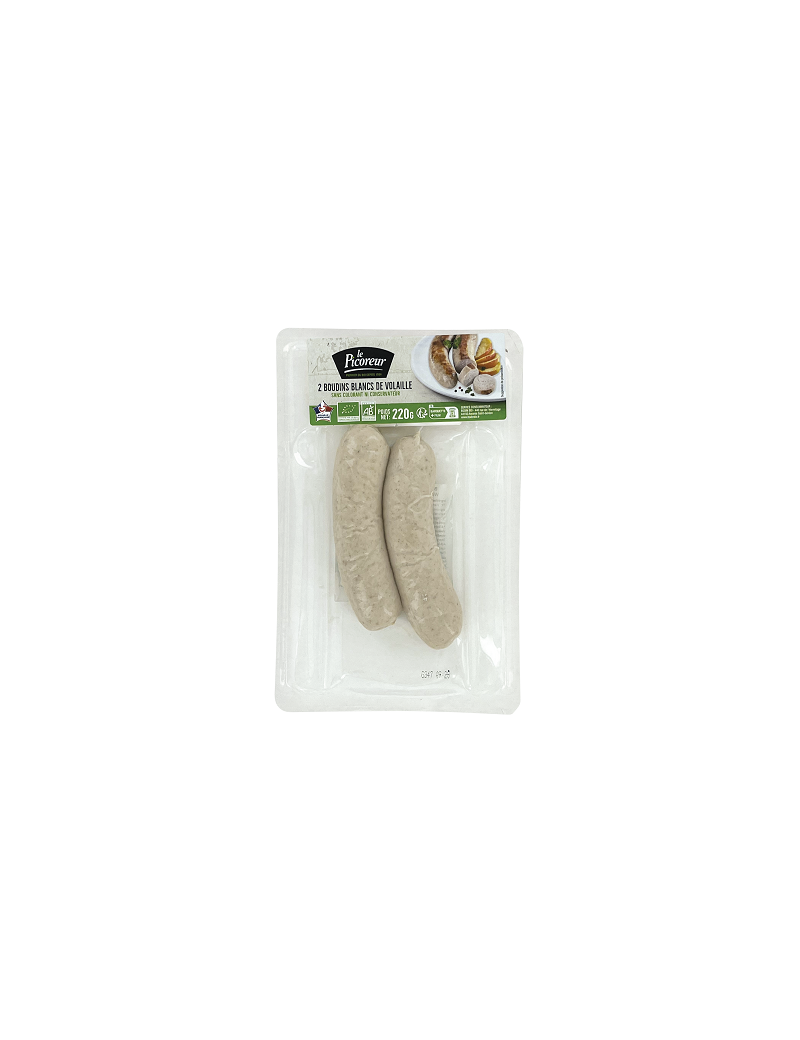 Een traditioneel recept voor witte pudding gemaakt met biologisch gevogeltevlees en subtiel gekruid met kruiden.