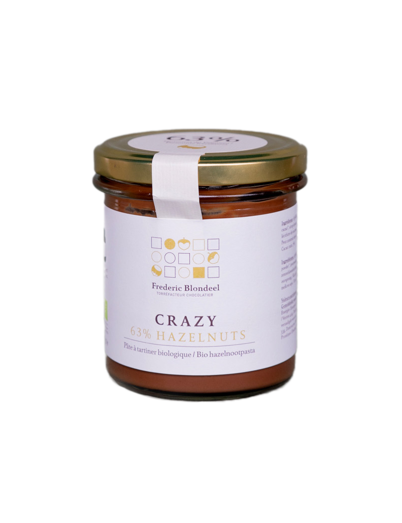 Onze spreads zijn een ode aan de hazelnoot.Dit product is puur genot. We spelen, maar we maken geen grapjes. Gevuld met geroosterde hazelnoten (tot 65%) is elk van onze spreads een eerbetoon aan de prachtige kwaliteit van de Italiaanse hazelnoot.CRAZY - 63% hazelnoten en op basis van bietsuiker.
