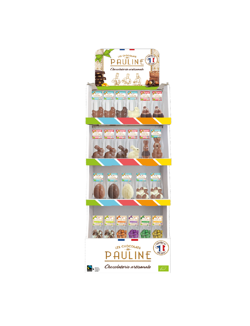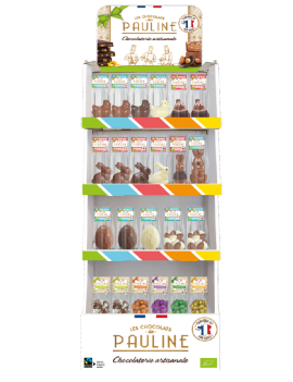 PA8878 Poule dodue au chocolat au lait 3760077188878 100g 5,47 € x 8 = 43,76 € PA8977 Poule Dodue au chocolat noir 3760077188977 100g 4,19 € x 4 = 16,76 € PA9103 Poule Dodue au chocolat blanc 3760077189103 100g 5,98 € x 4 = 23,92 € PA0803 Poule tricot au chocolat au lait - NOUVEAU 3760077180803 60g x 4,69 € 8 = 37,52 € PA5051 Lapin assis au chocolat au lait 3760077185051 60g 4,28 € x 14 = 59,92 € PA4504 Lapin assis au chocolat noir 3760077184504 60g 3,57 € x 7 = 24,99 € PA1091 Lapin assis au chocolat blanc - NOUVEAU 3760077181091 60g 4,29 € x 7 = 30,03 € PA1923 Lapin tricot au chocolat au lait - NOUVEAU 3760077181923 70g 5,47 € x 7 = 38,29 € PA8150 Maxi lapin au chocolat au lait 3370077588150 200g 9,80 € x 5 = 49,00 € PA0773 OEuf origami au chocolat au lait - NOUVEAU 3760077180773 120g 7,03 € x 4 = 28,12 € PA0797 OEuf origami au chocolat noir - NOUVEAU 3760077180797 120g 7,12 € x 4 = 28,48 € PA0780 OEuf origami au chocolat blanc -NOUVEAU 3760077180780 120g 7,60 € x 4 = 30,40 € PA6859 OEufs au chocolat blanc et lait 3370077586859 150g 7,80 € x 8 = 62,40 € PA0841 Sachet de fritures de Pâques aux 3 chocolats - NOUVEAU 3760077180841 150g 6,22 € x 12 = 74,64 € PA3576 Sachet de petits oeufs lacté croustillant enrobés de chocolat noir 3760077183576 150g 6,21 € x 6 = 37,26 € PA3613 Sachet de petits oeufs lacté croustillant enrobés de chocolat au lait 3760077183613 150g 6,85 € x 6 = 41,10 € PA3620 Sachet de petits oeufs praliné noisette enrobés de chocolat au lait 3760077183620 150g 7,10 € x 6 = 42,60 € PA7924 Sachet de petits oeufs praliné noisette enrobés de chocolat noir 3370077587924 150g 6,21 € x 6 = 37,26 €