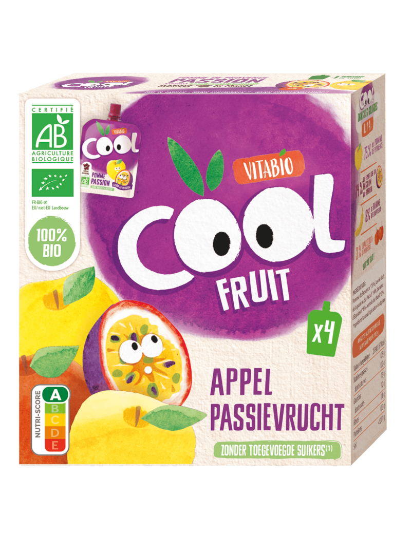 Pomme de France* 77,9%, jus de fruit de la passion* 14%, banane* 8%, jus de citron* 0,1%.*Ingrédients issus de l'agriculture biologique