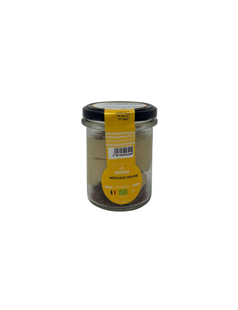 Geniet van onze speculoosmousse, een romig en heerlijk dessert dat de zachtheid van verse room en boter combineert met de rijke smaak van speculooskoekjes. Bereid met kwaliteitsvolle ingrediënten uit de biologische landbouw, is deze ambachtelijke mousse een echte verwennerij. Heerlijk om fris te serveren, puur of samen met fruit voor een extra vleugje lekkernij.