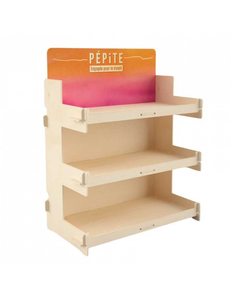 Houten display beschikbaar gesteld door Agrosourcing bij aankoop van minimaal 12 Pépite-referenties per jaar om op te vullen. Afmetingen: Breedte: 58 cm, diepte: 32 cm, hoogte 75 cm.