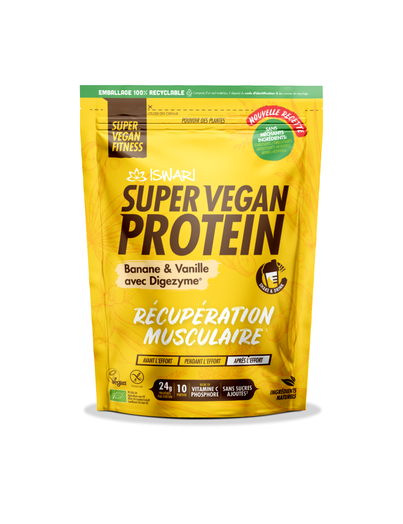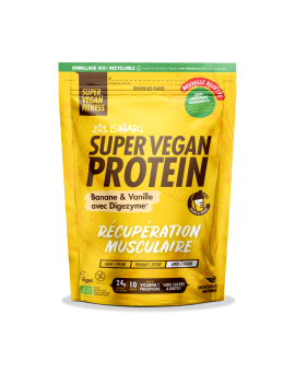 SUPER VEGAN PROTEIN BANANA & VANILLA is ontworpen om uw resultaten na de training te maximaliseren, wat bijdraagt ??aan een grotere spiermassa en een sneller herstel bevordert. Deze mix levert 24 gram plantaardige eiwitten per portie, inclusief spijsverteringsenzymen en zonder toegevoegde suikers, op een handige en voedzame manier. En het beste gedeelte? 100% plantaardig, alleen natuurlijke ingrediënten. Bevat van nature voorkomende suikers. Digezyme® verbetert de stofwisselingsgezondheid, met name de darmgezondheid + draagt ??bij aan het verminderen van spierpijn en spierzwakte na overmatige inspanning.