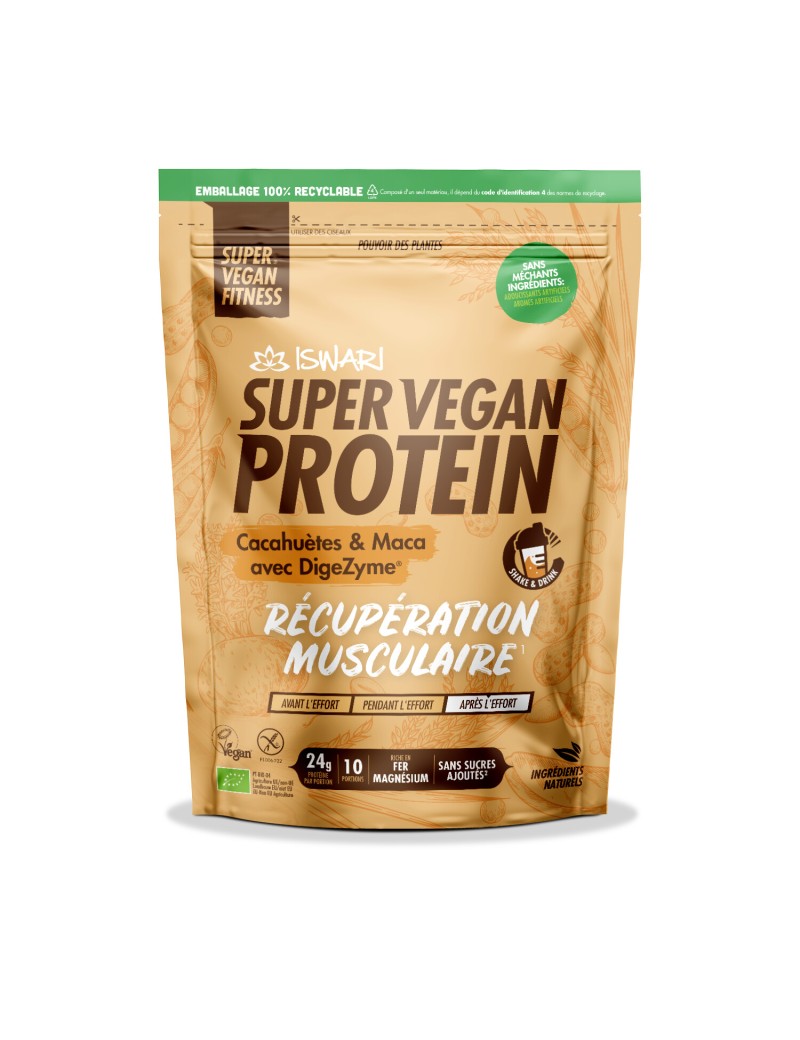 SUPER VEGAN PEANUTS & MACA is ontwikkeld om uw resultaten na de training te maximaliseren, wat bijdraagt ??aan een toename van de spiermassa en een sneller herstel bevordert. Deze formule levert 24 gram plantaardige eiwitten per portie, met alle kracht van macawortel, op een handige en voedzame manier. En het beste gedeelte? 100% plantaardig, alleen natuurlijke ingrediënten. Bevat van nature voorkomende suikers. Digezyme® verbetert de stofwisselingsgezondheid, met name de darmgezondheid + draagt ??bij aan het verminderen van spierpijn en spierzwakte na overmatige inspanning.