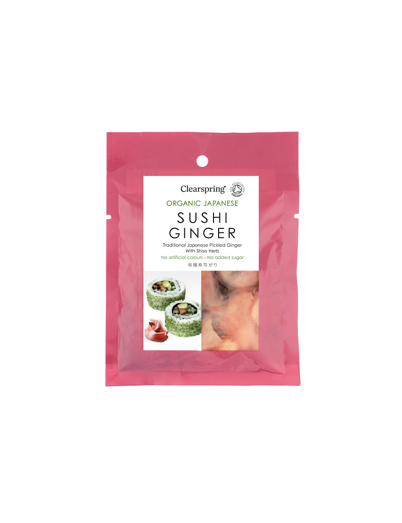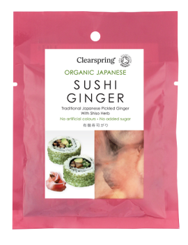 Sushi Ginger. Met zijn frisse, pittige smaak is de Clearspring Sushi Ginger een stimulatie voor de smaakpapillen. Hij wordt bijna altijd opgediend bij sushi, tussen 2 happen in, als zuivering van de mond.
