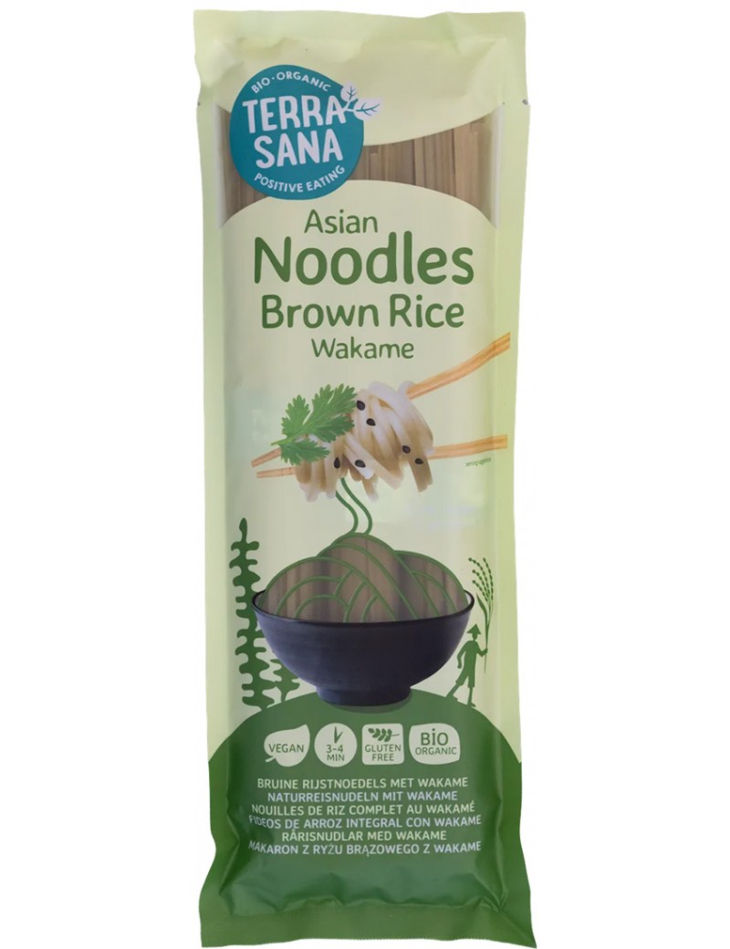 Glutenvrije volle rijst noedels met wakame zeewier. Bereiding: Breng een kookpot gevuld met water aan de kook, de deegwaren bijvoegen tot ze goed onder water staan. Een keer terug aan de kook, op middelmatig vuur zetten. 4-5 minuten laten koken. De noedels afgieten en schrikken in koud water.