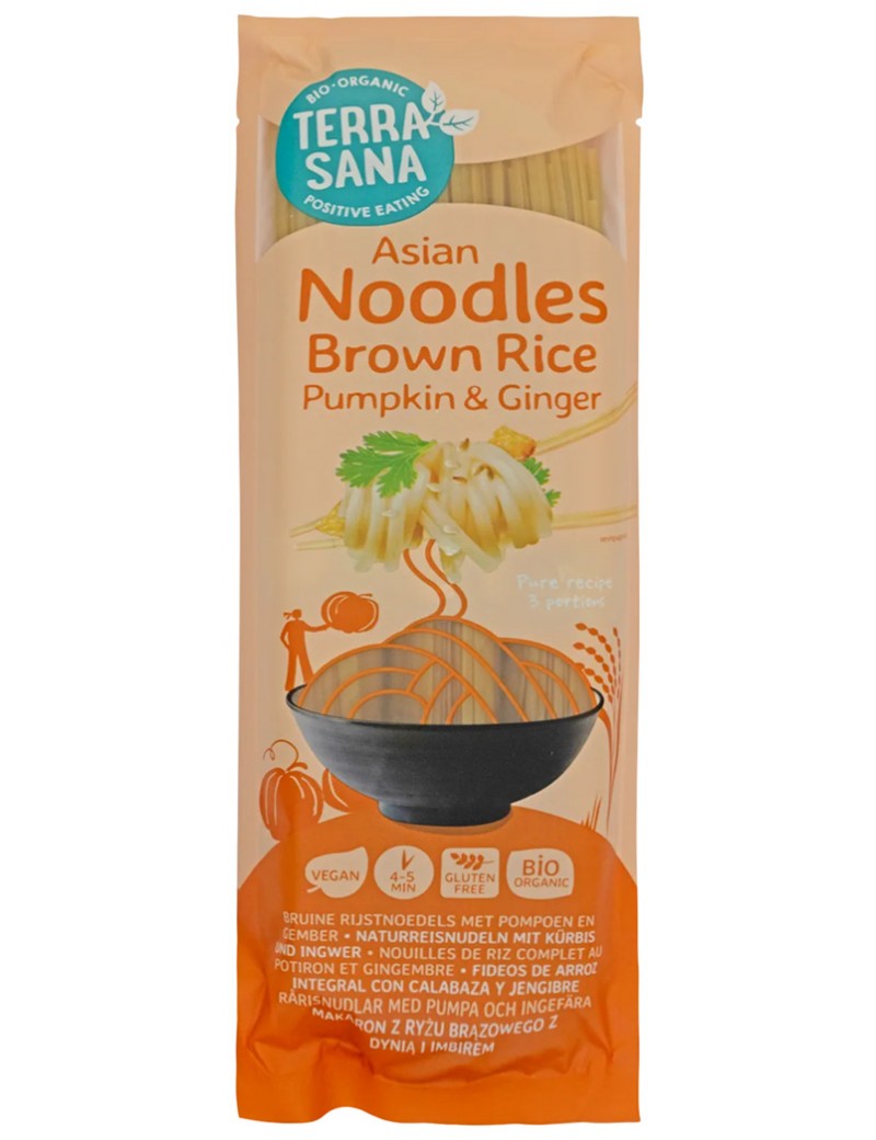 Glutenvrije volle rijst noedels, met pompoen en gember. Bereiding: Breng een kookpot gevuld met water aan de kook, de deegwaren bijvoegen tot ze goed onder water staan. Een keer terug aan de kook, op middelmatig vuur zetten. 4-5 minuten laten koken. De noedels afgieten en schrikken in koud water.