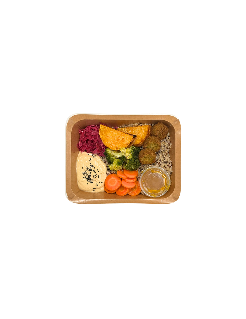 Falafel, quinoa, pompoen, biet, hummus, kurkuma sinaasappel saus