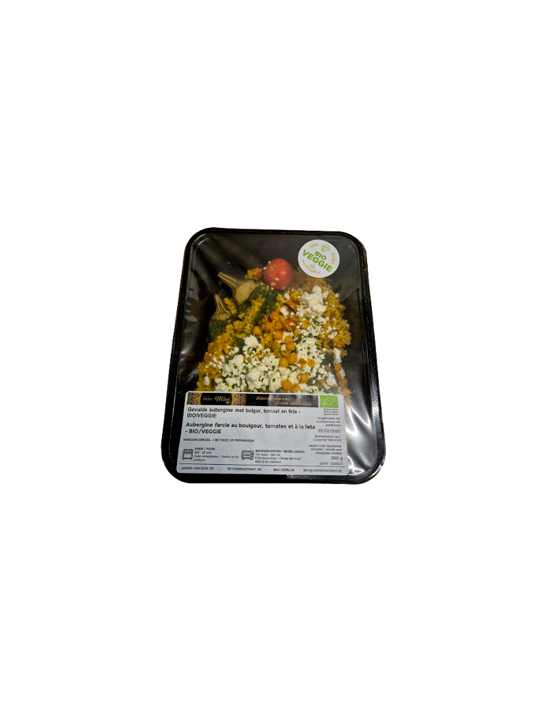 Een lekker gegrilde aubergine opgevuld met een kruidige bulgurmengeling, Afgewerkt met feta, gegrilde kikkererwten en salsa verde