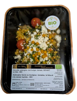 Een lekker gegrilde aubergine opgevuld met een kruidige bulgurmengeling met gehakt, Afgewerkt met feta, gegrilde kikkererwten en salsa verde