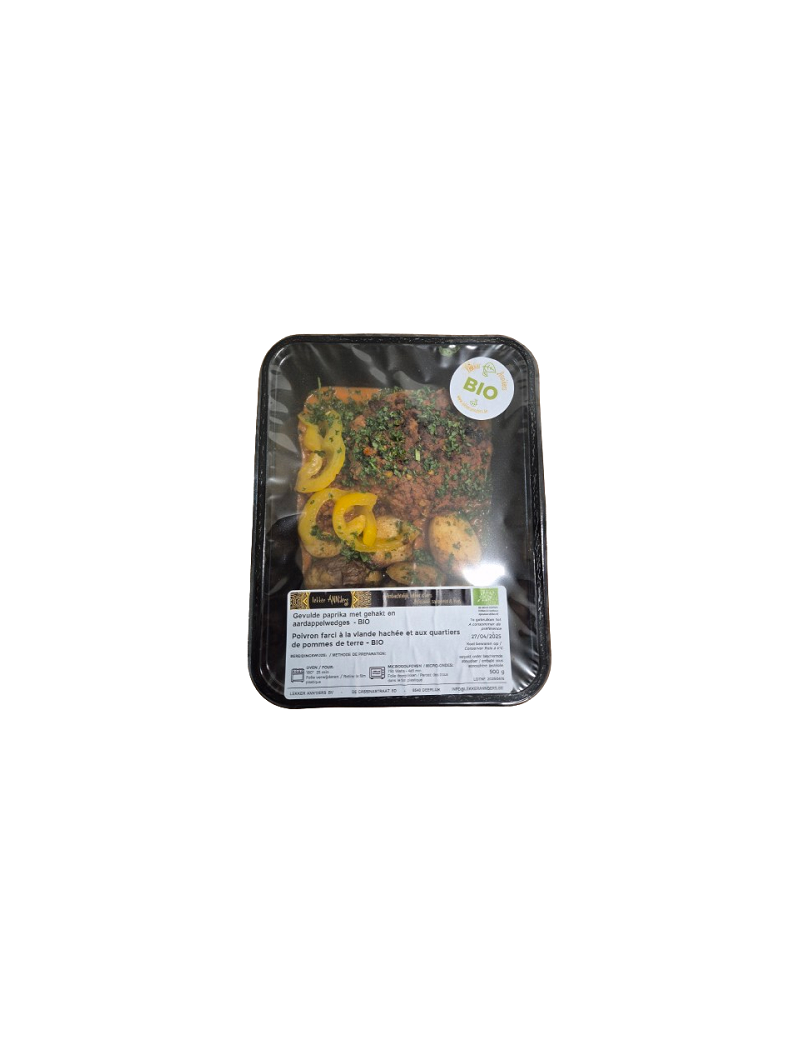 Gevulde gele paprika met een mengeling van gehakt, tomaten marinade en courgette, geserveerd met een lekker tomatensausje en krudige aardappelwedges.