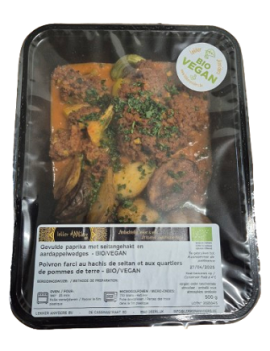 Gevulde gele paprika met een mengeling van seitangehakt, tomaten marinade en courgette, geserveerd met een lekker tomatensausje en krudige aardappelwedges