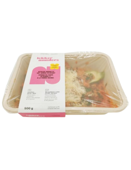 Courgette gevuld met een kruidige vulling quinoa, getomateerde groentjes en gehakt, Geserveerd met een paprikasausje en afgewerkt met gemalen kaas.