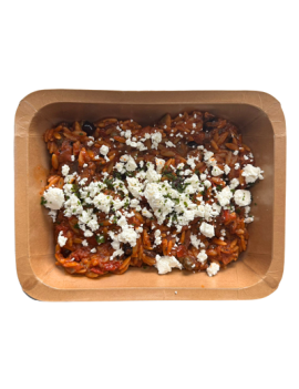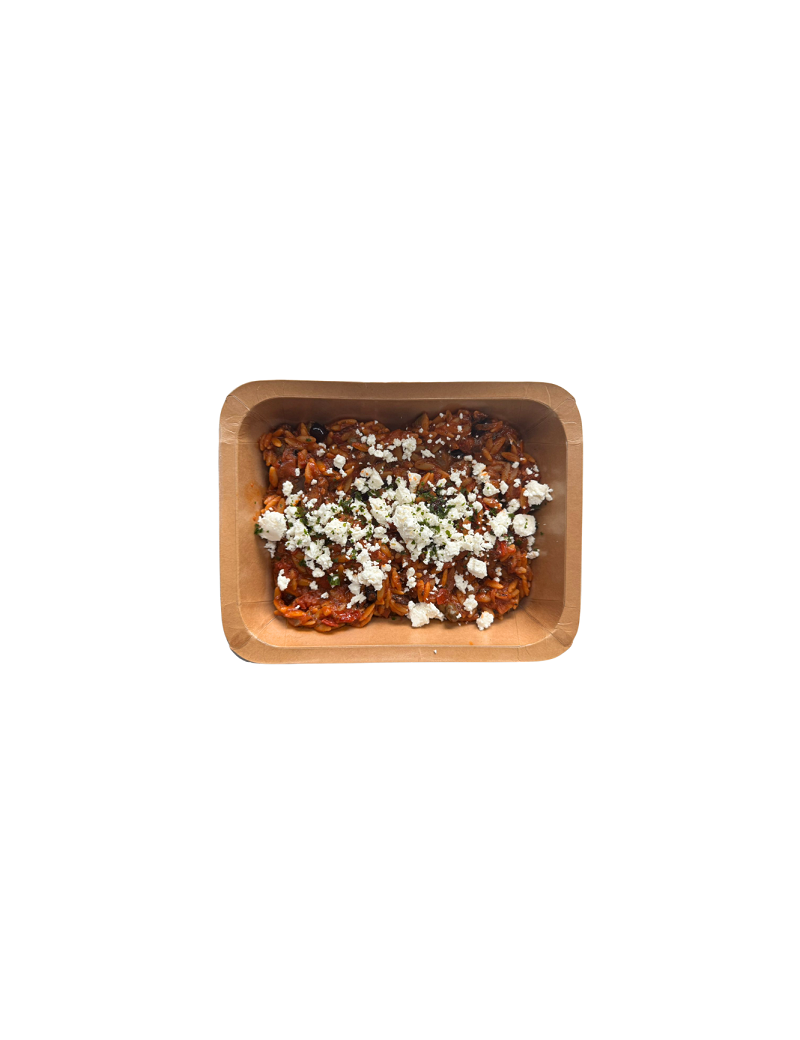 De Mediterranean Orzo & Feta combineert orzo-pasta, romige feta, champignons en rucola, verfijnd met zwarte olijven en kappertjes. Een frisse en evenwichtige schotel met mediterrane smaken, ideaal voor een lichte en smaakvolle maaltijd.