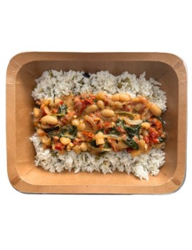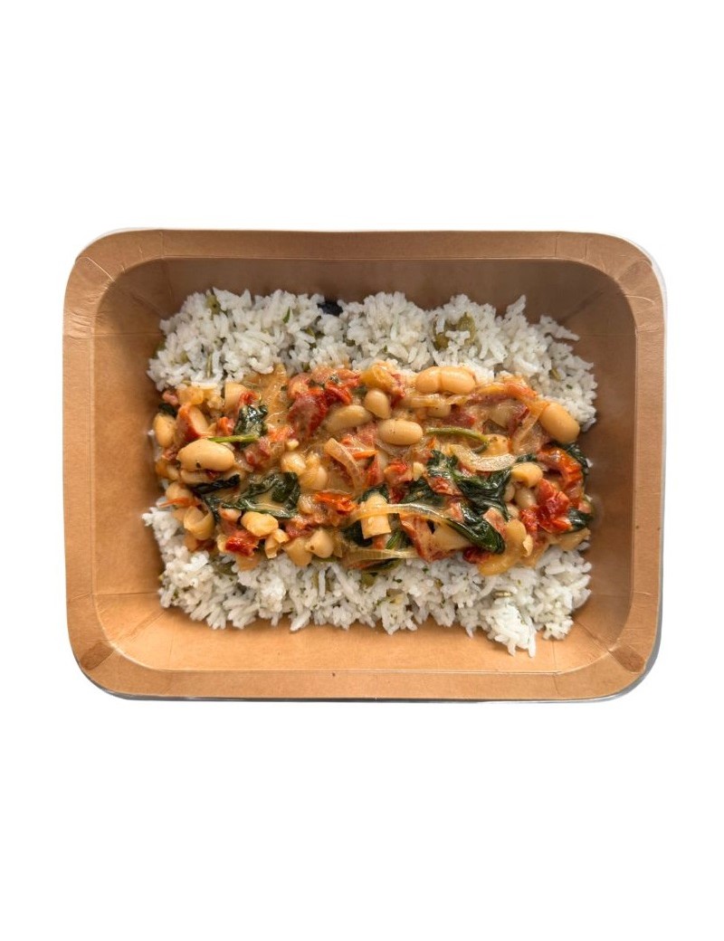 De Nutty Creamy Rice combineert romige rijst met kokosmelk, witte bonen en spinazie, verfijnd met zongedroogde tomaten, pompoenpitten en pinda’s. Een vegetarisch gerecht, smeuïg en evenwichtig, vol exotische en smaakvolle toetsen.